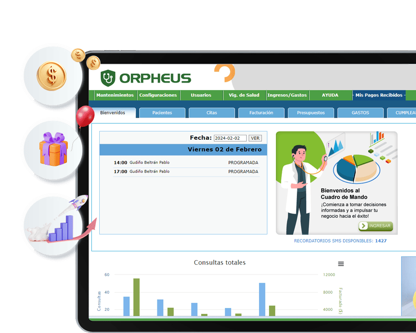 Con Orpheus no solo mejoras el trabajo clínico sino también la experiencia de tus pacientes, la gestión administrativa, financiera y la toma de desiciones inteligentes.